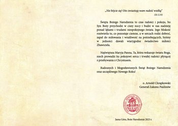 Nie bójcie się, oto zwiastuję wam Radość Wielką. Święta Bożego Narodzenia to czas radości, pokoju, bo Syn Boży przychodzi w ciszy nocy i budzi w każdym z nas nadzieję ponad lękami, trudnościami, niespokojnego świata. Jego bliskość rozświetla to, co pozostaje ciemne, a w sercach rodzi dobroć, zapał do miłowania i wrażliwość na potrzebujących, byśmy w jedności i zgodzie dawali wiarygodne świadectwo miłości przychodzącego Pana. Najświętsza Maria Panna, Ta, która wskazuje światu Boga, niech prowadzi ku pokojowi serca i trwałej radości płynącej z nieustannego przebywania z Chrystusem. Radosnych i błogosławionych Świąt Bożego Narodzenia oraz szczęśliwego Nowego Roku.