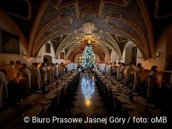 W czasie wieczerzy wigilijnej wszyscy ojcowie śpiewają kolędy. - To bardzo ciekawy zwyczaj taki jasnogórski, który również jest podejmowany w innych klasztorach. Tutaj, jeśli blisko setka mnichów inicjuje kolędy, to ten śpiew niesie się mocno w klasztorze. Każdy stół podejmuje śpiew innej kolędy, często jest nawet taki konkurs – rywalizacja między stołami - mówi ojciec Michał Bortnik. Zwraca uwagę, że istotne jest wzajemne spotkanie przy wigilijnym stole, niezwykle ważne jest zatrzymanie się nad miłością Boga, która przychodzi do każdego z nas. Najgłębiej tej miłości doświadczamy, kiedy przyjmujemy Komunię Świętą, bo Jezus stał się człowiekiem i pozostał z nami na ziemi w tym pięknym sakramencie Eucharystii, w którym Bóg wchodzi konkretnie do naszego życia.